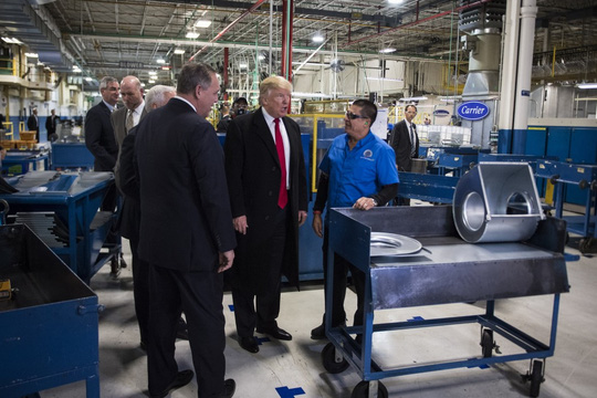 Ông Trump trò chuyện với công nhân Công ty Carrier ngày 1-12. Ảnh: THE WASHINGTON POST