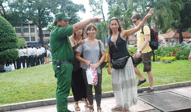 Tất bật đón tiếp và đưa du khách qua đường giữa nhà thờ Đức Bà và Bưu điện TP (Q.1), anh Trần Anh Tuấn (26 tuổi), thành viên đội TNXP tươi cười, cho biết làm công việc này đã được 3 năm nay. Hằng ngày anh ra đây cùng với anh em trong đội giữ gìn an ninh trật tự khu vực, đưa du khách sang đường và bảo vệ an toàn trong hoạt động vui chơi, tham quan, chụp ảnh.
