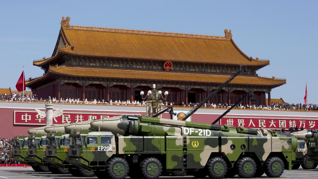 Quân đội Trung Quốc phô trương hỏa tiễn đạn đạo chống hạm DF-21D trong cuộc diễu binh tại Bắc Kinh ngày 03/09/2015.