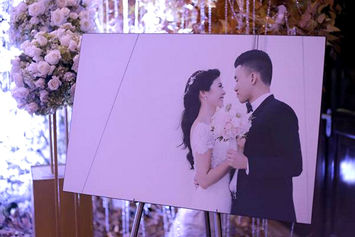 Ảnh cưới lãng mạn của cô dâu chú rể được trưng bày bên ngoài sảnh tiệc.