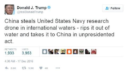 Trên mạng xã hội Twitter ngày 17/12, Tổng thống đắc cử Donald Trump viết rằng Trung Quốc cứ giữ chiếc tàu lặn tự hành (UUV) của Mỹ mà hải quân nước này bắt trộm ở Biển Đông, sau khi Trung Quốc bảo sẽ trả lại cho Mỹ.