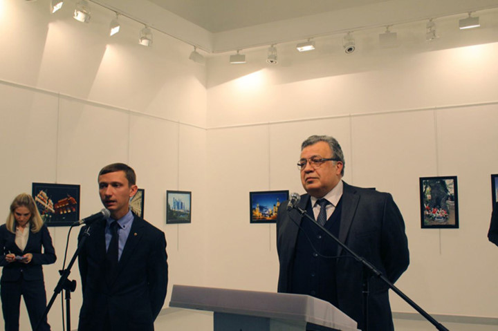 Đại sứ Nga tại Thổ Nhĩ Kỳ, Andrey Karlov, đến khai mạc một triển lãm ảnh của Nga ở Ankara. Người thanh niên phía sau là hung thủ chuẩn bị ám sát ông.