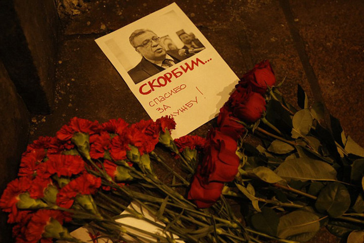 Di ảnh Đại sứ Karlov bên những bó hoa tưởng nhớ ông bên ngoài trụ sở Bộ Ngoại giao Nga.