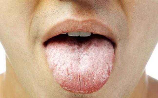 Lưỡi có nhiều mảng bám tráng do nhiễm nấm Candida. Ảnh: Reader's Digest.