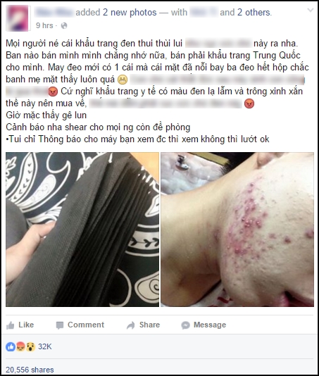 Không chỉ bán trôi nổi ở các ven đường, vỉa hè, những loại sản phẩm giá rẻ này còn được bán online tràn lan trên các trang mạng điện tử. Thông tin về loại khẩu trang này càng trở nên rầm rộ hơn khi 1 bạn trẻ đăng lên trang cá nhân của mình tấm ảnh gương mặt bị nổi mụn rất nhiều, có chỗ còn lở loét khi sử dụng 'khẩu trang y tế' đen. Hình ảnh này ngay lập tức được cư dân mạng quan tâm, chia sẻ và bày tỏ sự e ngại đáng kể.