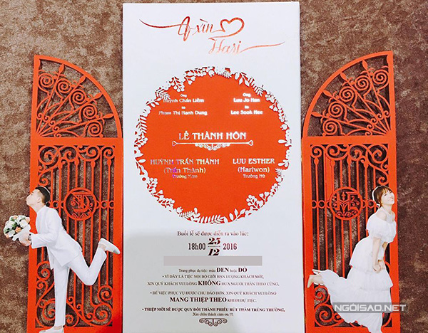 Trấn Thành - Hari Won đã gửi thiệp mời cho 300 vị khách là bạn bè, đồng nghiệp thân thiết cho đám cưới sẽ diễn ra vào ngày 25/12 tới. Thiệp cưới của cặp đôi được thiết kế khá công phu với tông màu cam chủ đạo. Phía bìa thiệp là hình cánh cửa có gắn ảnh của hai nhân vật chính. Giá của thiệp cưới này được tiết lộ hơn 100.000 đồng/chiếc. Đây là mức giá in cao so với mặt bằng chung.