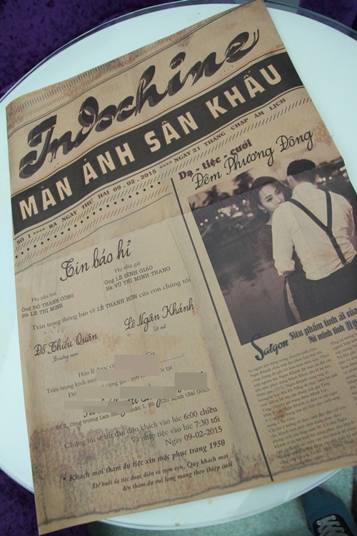 Đầu năm 2015, diễn viên Ngân Khánh chính thức lên xe hoa. Tấm thiệp cưới của cô nàng được tung ra thu hút sự chú ý. Ngân Khánh gọi đám cưới của mình là vở nhạc kịch Đêm Phương Đông, là siêu phẩm tình ái, huy hoàng, diễm lệ. Thiệp của Ngân Khánh có hai phiên bản tiếng Anh và tiếng Việt, được thiết kế giống tấm vé xem biểu diễn ca nhạc phong cách cổ điển như những năm 50 của thế kỷ trước. Nữ diễn viên cho biết, cô vốn yêu thích phong cách cổ điển nên mong muốn tất cả mọi khâu trong bữa tiệc đều mang phong cách vintage.