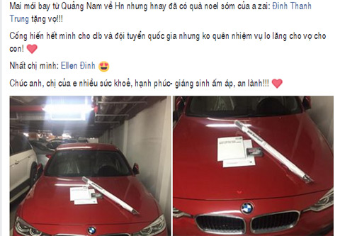 Anh em đồng nghiệp của tuyển thủ Đinh Thanh Trung được phen lác mắt. Chàng tuyển thủ VC đã chi mạnh tay mua tặng vợ món quà Giáng Sinh ý nghĩa và đắt tiền. Đó chính là chiếc siêu xe BMW màu đỏ chót.