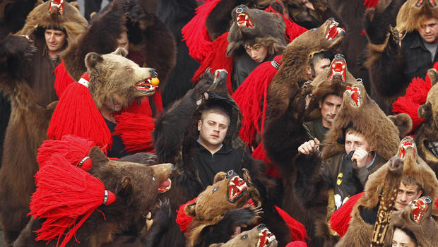 Các trẻ em Rumani ăn mặc như con gấu nhảy với một ban nhạc ở Bucharest. Người Romania thường mặc trang phục gấu trong dịp Giáng sinh và lễ chào đón năm mới để thực hiện các điệu múa truyền thống được cho là sẽ mang lại may mắn và thịnh vượng trong năm mới.