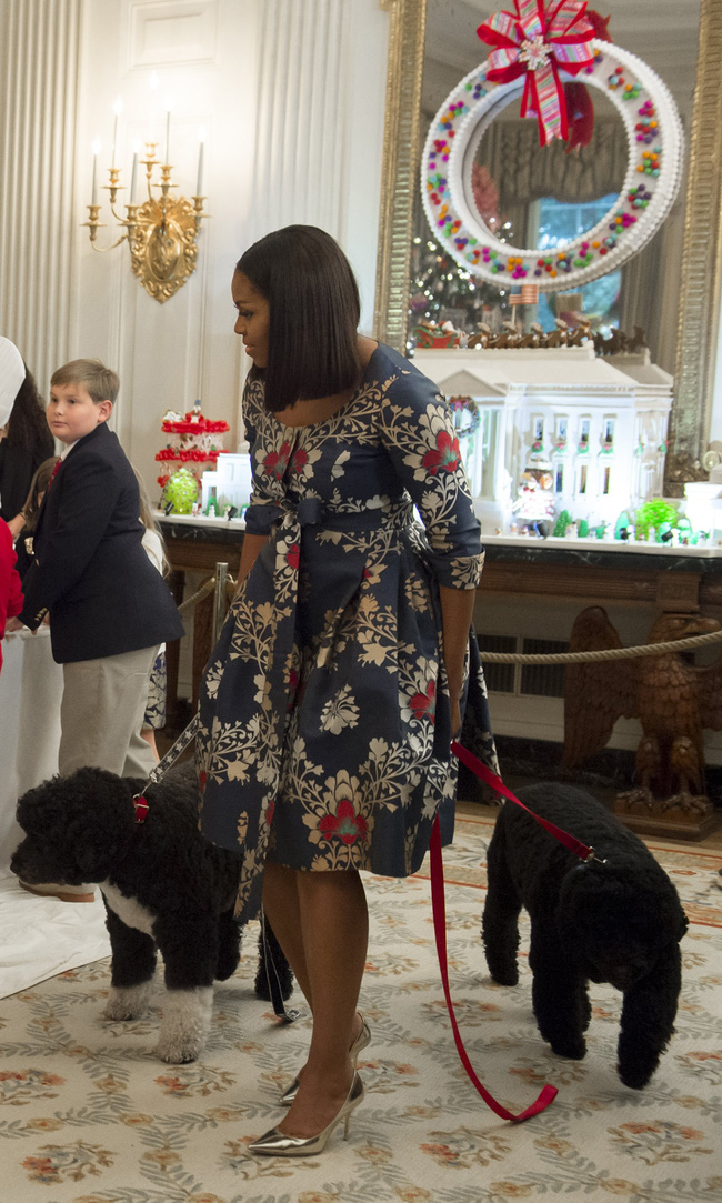 10. Cuối tháng 11, bà Obama cùng với hai chú chó Sunny và Bo trong một bữa tiệc ở Nhà Trắng: