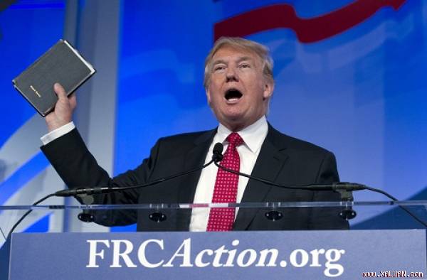 Donald Trump cầm cuốn Kinh Thánh phát biểu. Ảnh: Rightwingwatch