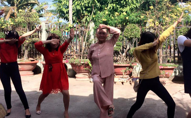 Trong bộ bà ba gấm màu hồng giản dị, bà cụ tạo dáng lúc thì như múa võ, khi lại giống động tác của Tôn Ngộ Không. Bà cũng không quên để ý cách tạo dáng xì teen của mấy đứa cháu gái để làm theo cho đồng bộ.