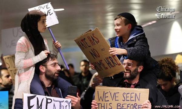 Khi đó Adin đội mũ chỏm của người Do Thái, tay cầm bảng hiệu ghi "Không có chỗ cho thù ghét", còn Meryem tay cầm bảng hiệu "Tình yêu". Cả hai đều được bố cho ngồi trên vai, trong cuộc biểu tình tại sân bay quốc tế O’Hare, bang Chicago nhằm phản đối lệnh hạn chế nhập cư của Tổng thống Trump.