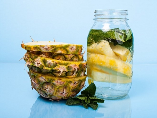 Cắt một quả dứa, cho vào một bình nước với 3,7 lít nước (có thể thêm đá nếu bạn muốn). Nước dứa sẽ phát huy hiệu quả đối với sức khỏe và không chứa đường như nước ép.