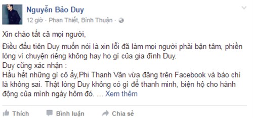 Duy cũng xác nhận hầu hết những gì Phi Thanh Vân vừa đăng trên Facebook và báo chí là không sai. Thật lòng Duy không có gì để thanh minh, biện hộ cho hành động của mình ngày hôm đó.