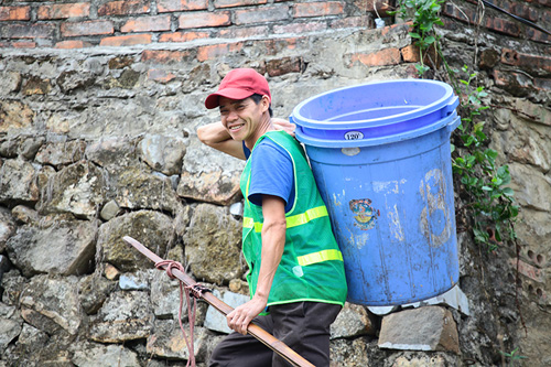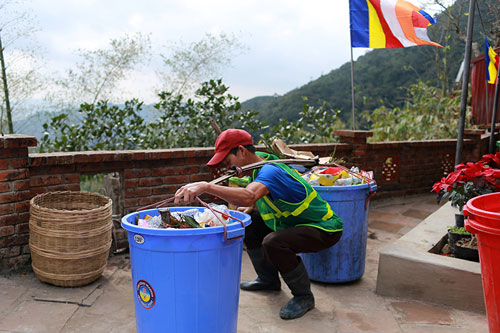 Dáng người nhỏ thó, nhưng bước chân thoăn thoắt leo qua hàng trăm bậc thang dẫn lên chùa Hoa Yên (thuộc quần thể danh thắng Yên Tử, Quảng Ninh), anh Lý Văn Dân (thôn Năm Mẫu, Uông Bí, Quảng Ninh) gánh trên mình hai thùng phuy nhựa loại 120l chứa khoảng 50kg rác về nơi tập kết. Anh kể: “Mới từ sáng đến trưa mà tôi đã gánh được 16 lượt rồi, cơ man nào là rác đủ loại từ tiền vàng, que hương cháy dở cho tới vỏ bánh kẹo, thức ăn thừa của du khách thập phương xả ra khắp sân chùa".