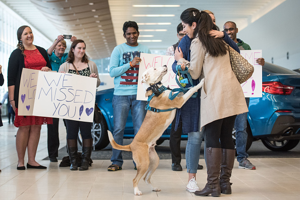 Nữ kỹ sư Nazanin Zinouri được các đồng nghiệp, và con chó của cô, tiếp đón tại phi trường Greenville, South Carolina ngày thứ Hai. Cô Zinouri là di dân từ Iran, đã sống ở Mỹ bảy năm. Sau khi về nước thăm gia đình, cô bị cấm vào Mỹ vì sắc lệnh của chính phủ Trump. Nhờ một phán quyết của tòa liên bang, hàng ngàn người như Zinouri đã được phép vào Mỹ từ cuối tuần qua. (Sean Rayford/ Getty Images)