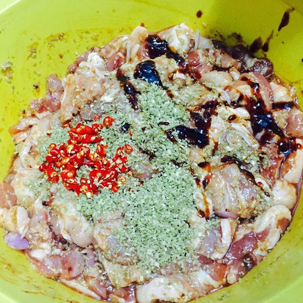 gà vào (1kg tương đương với 4 lòng đỏ). Cho hành tỏi ớt băm nhuyễn, sả xay nhuyễn vào.