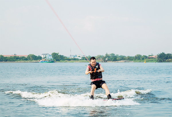 Ông bầu Vũ Khắc Tiệp khá căng thẳng trong lần đầu chơi trò lướt sóng.