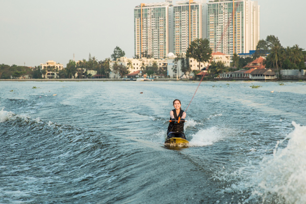 Ngọc Trinh cười tít mắt, ngồi trên ván trượt, rẽ sóng, vi vu giữa làn nước.