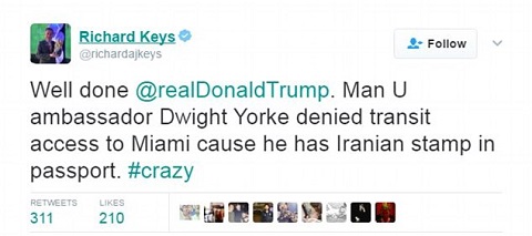 Cụ thể, Đại sứ Man United Dwight Yorke đang trên đường về quê nhà ở Trinidad & Tobago thì bị chặn lại ở Miami, Mỹ. Cựu danh thủ này không được phép nhập cảnh vào Mỹ chỉ vì trong hộ chiếu của anh có một con dấu tại nước Iran.