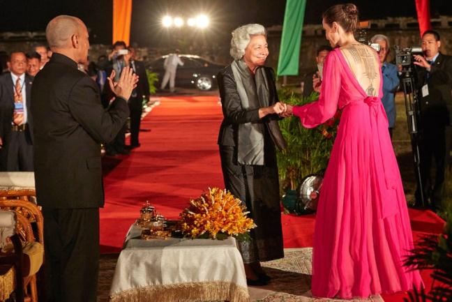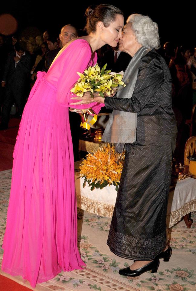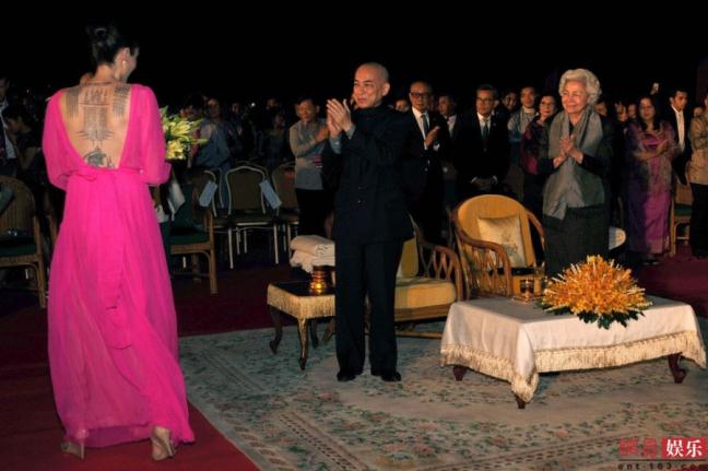 Angelina Jolie cùng các con đến Campuchia để quảng bá bộ phim cô làm đại diện. Người đẹp có cơ hội diện kiến nhà vua Campuchia. Jolie mặc chiếc váy hồng hở hình xăm trên lưng.