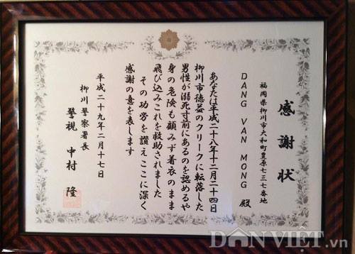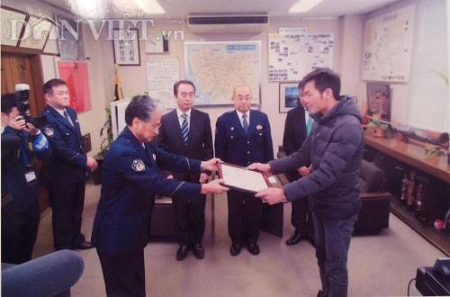 Giám đốc công an thành phố Yanagawa, tỉnh Fukuoka trao tặng giấy khen cho anh Mong.