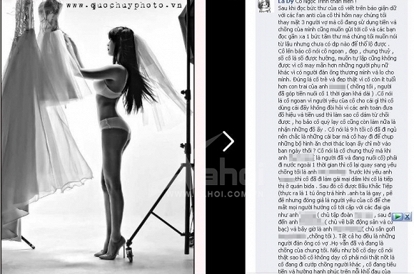 Được biết, bức “tâm thư” này xuất hiện sau khi bộ ảnh thời trang nội y cô dâu của “Nữ hoàng nội y” được đăng tải. Người phụ nữ có tên La Dy tỏ ra vô cùng bức xúc và không ngần ngại hé lộ tên tuổi của một số đại gia mà Ngọc Trinh từng cặp kè, trong đó có chồng của cô.