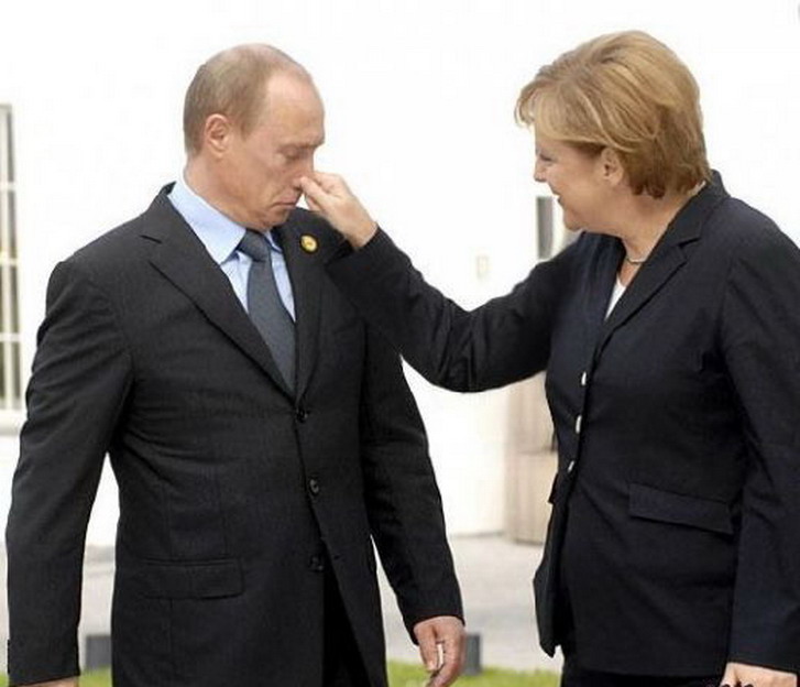 Bà Merkel đứng dậy trước mặt ông, những phản xạ xưa cũ của bà bỗng được kích thích, ông Putin đã siết chặt cánh tay bà. Bầu không khí đối đầu luôn tồn tại giữa Merkel và Putin. Tuy nhiên ông Putin đã học được rất nhiều từ đó và tiếp tục nghiên cứu phương pháp chế ngự bà trong chính môn sở trường của bà. Trong những cuộc va chạm, thật sự ấn tượng rằng nữ thủ tướng và ngài tổng thống giống như một cặp vợ chồng già đã quá quen các mánh khóe của nhau. Bà Merkel chia sẻ rằng phải luôn cảnh giác với ông ấy và còn ông Putin cũng luôn thận trọng tương tự. Thông điệp của ông Putin muốn nhắc bà Merkel rằng không có gì khác nhau đâu, ăn miếng trả miếng cả mà thôi.