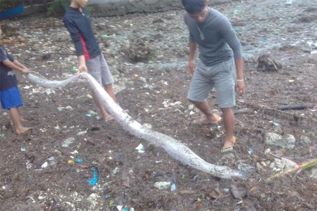 Con cá này dài hơn 2m, mình dẹt, đầu hình thù dị dạng và có hàm răng sắc nhọn. Những người dân ở đây nói rằng, họ thấy xác con vật dạt vào bờ, nhiều người đã tập trung lại khênh nó lên một bãi đất trống.