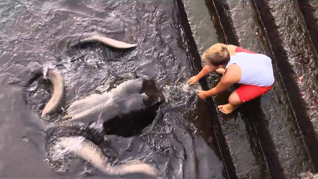 Tuy nhiên cậu bé này lại có hành động "kết bạn" với loài sinh vật đáng sợ đó, cảnh tượng cậu bé cho cá ăn khiến nhiều người phải bất ngờ.
