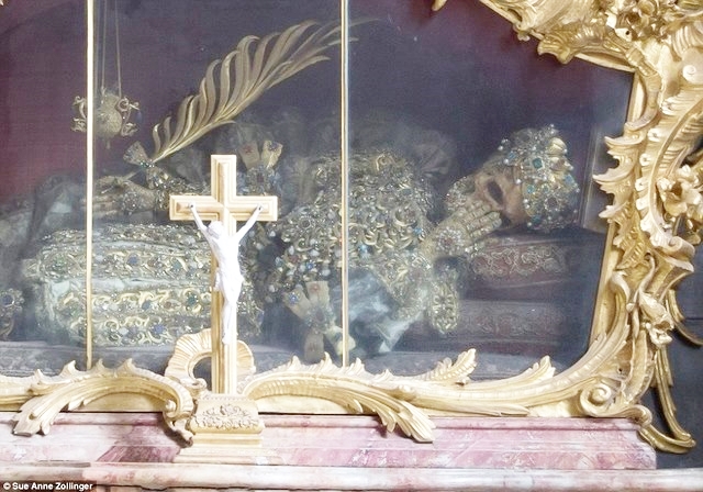 Bộ xương thánh Hyacinth đeo vương miện vàng.