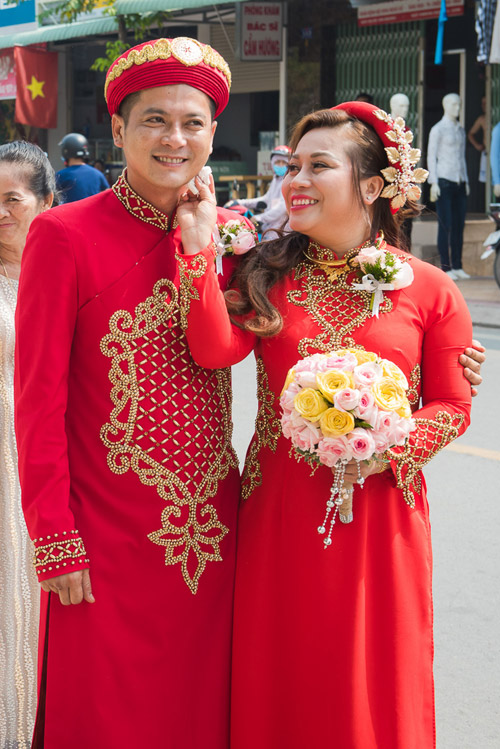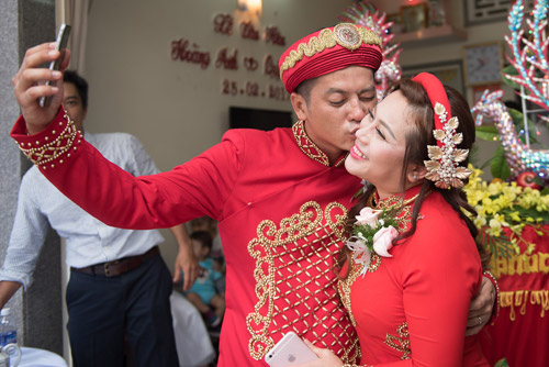 Cô dâu chú rể cùng đoàn rước dâu trở về nhà của diễn viên Hoàng Anh. Nam diễn viên không thể giấu nổi niềm vui mừng khi cưới được vợ.