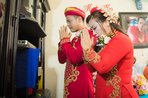 Hai vợ chồng làm lễ khấn gia tiên trong ngày đón dâu.