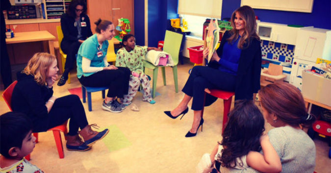 Hôm 2/3 là “Ngày toàn nước Mỹ đọc sách”. Đệ nhất phu nhân gặp gỡ các trẻ em tại Trung tâm Y tế tại phòng đồ chơi. Bà Melania Trump nói: “Các cháu có biết hôm nay là ngày gì không? Là ngày đọc sách. Tôi đến đây để khuyến khích các cháu đọc và chỉ nghĩ về các cuốn sách. Điều gì các cháu muốn đạt được trong cuộc sống và mở rộng chân trời của mình, hãy nghĩ xa hơn nữa”, theo CNN.