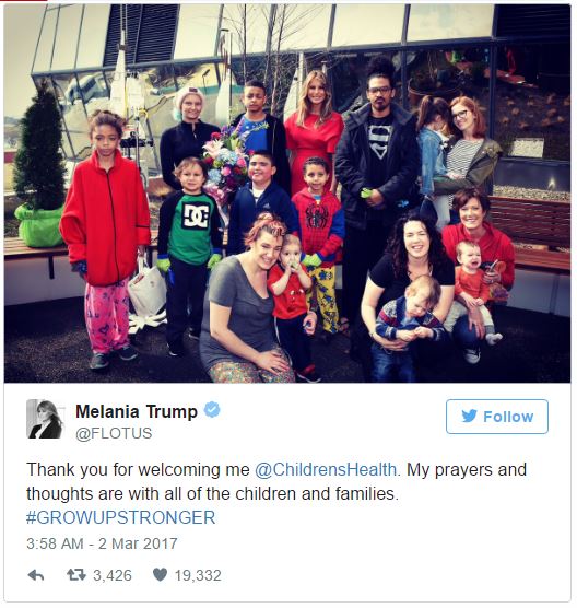 Hiện nay, Đệ nhất phu nhân không ở thủ đô Washington cùng Tổng thống, mà ở tại New York cùng con trai. Hôm 1/3, sau khi tham dự buổi diễn thuyết của Tổng thống Trump tại Quốc hội, bà Melania Trump đã đến thăm Bệnh viện Nhi Quốc gia tại thủ đô Washington. Sau đó bà đã đăng trên Twitter: “Cám ơn các bạn đã chào đón tôi. Những lời cầu nguyện và suy nghĩ của tôi luôn về tất cả trẻ em và các gia đình!”.
