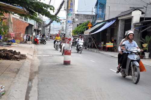Ghi nhận tuyến đường dài khoảng 1km với hàng chục cây trụ điện án ngữ giữa đường, người đi xe máy muốn lưu thông phải lạng lách tránh hàng trụ điện này.
