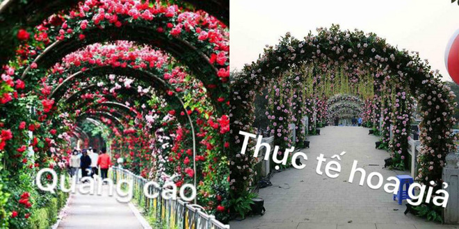 Sáng 3/3, hình ảnh thực tế lễ hội hoa hồng Bulgaria tại Công viên Thống Nhất (Hà Nội) được dân mạng so sánh với những điều quảng cáo trước đó. Ban tổ chức hứa hẹn mang đến không gian trưng bày hoa hồng đẹp với hơn 300 loại hoa khoe sắc và cổng vòm cầu kỳ. Tuy nhiên thực tế, du khách thất vọng vì cổng chào hoàn toàn kết bằng hoa giả. Ảnh: Minh Hồng.