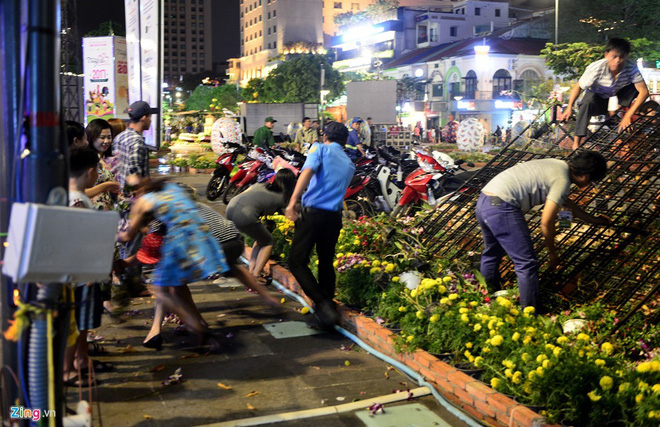 Trong dịp Tết Nguyên đán 2017, đường hoa xuân Nguyễn Huệ dự kiến diễn ra đến tối mùng 4 Tết. Sau đó, đường hoa được kéo dài thêm một ngày, tạo điều kiện cho hàng chục nghìn người dân thưởng lãm. Hình ảnh không đẹp xảy ra khi kết thúc, nhiều người xông qua hàng rào bảo vệ để "mót" hoa. Ảnh: Lê Quân.