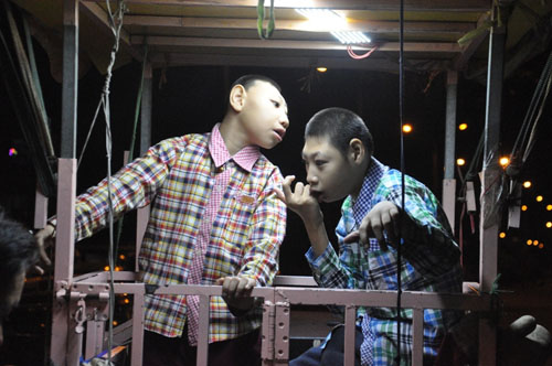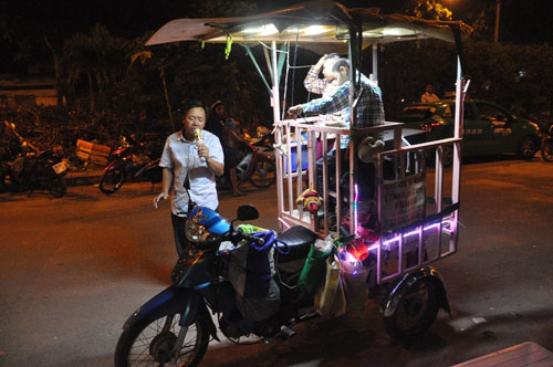 Anh mua xe máy cũ và thiết chiếc lồng sắt cho hai con trai ngồi bên trong. Mỗi tuần, anh chở theo hai con trai đi hát rong bán kẹo khoảng 3, 4 lần.