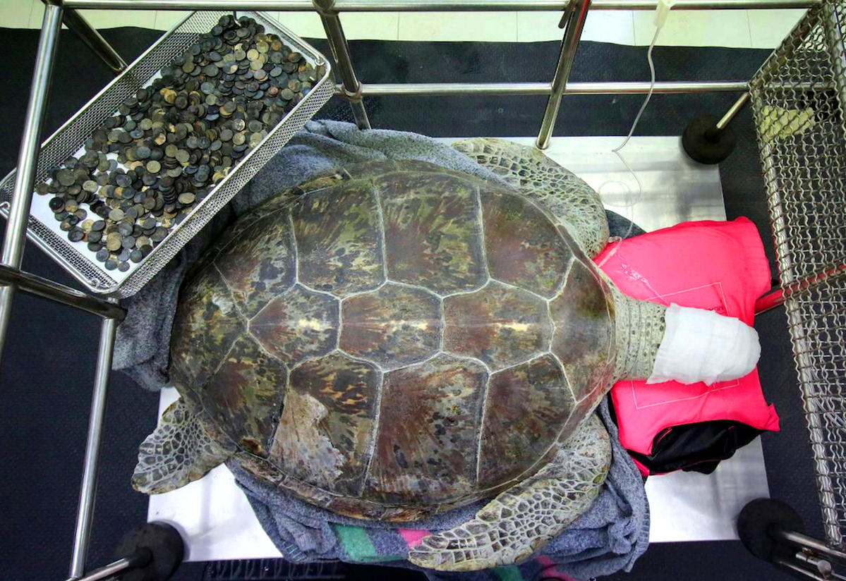 BANGKOK - Các bác sĩ thú y Thái Lan đã lấy ra được tổng cộng 915 đồng tiền tròn từ trong bụng của một con rùa biển 25 tuổi. Con rùa đã nuốt những đồng tiền được người ta ném vào hồ nước của nó để cầu xin may mắn.