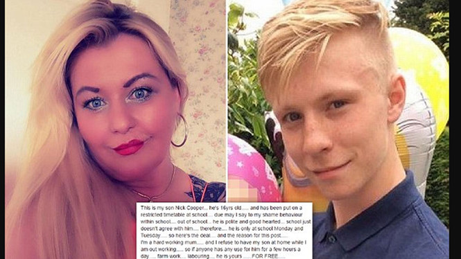 Tờ Daily Mail ngày 5.3 đưa tin Donna Cooper ở thị trấn Hornsea (Anh) đã rao trên một trang facebook nhóm ở địa phương rằng cô sẽ cho mọi người thuê Nick, đứa con trai 16 tuổi của mình, làm việc miễn phí vì bực mình về việc cu cậu suốt ngày chỉ quanh quẩn ở nhà, chẳng làm gì cả sau khi bị hạn chế đến trường do vi phạm kỷ luật.