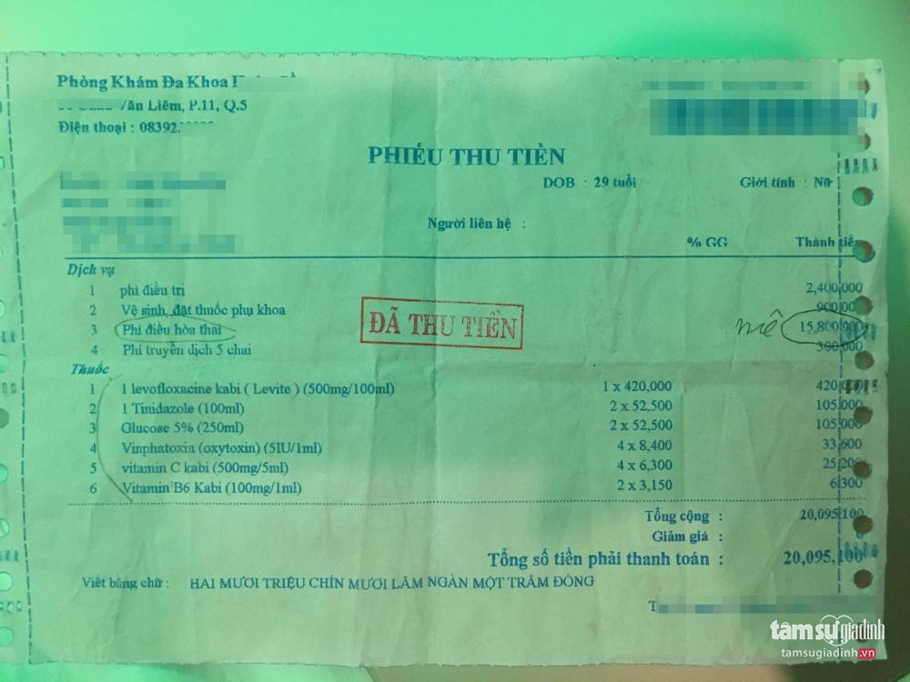 Chị Tr. kể tiếp: “Lúc đó người phiên dịch nói rằng phương án hút vừa an toàn vừa nhanh, khoảng chừng 2-5 phút là xong. Do vậy nên tôi mới đồng ý kí vào hoá đơn và đóng số tiền hơn 20 triệu đồng”.