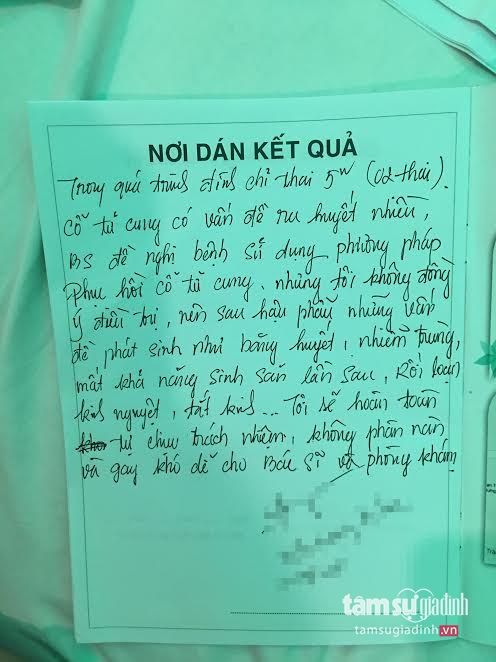 Lập tức nữ y tá đề nghị chị viết một lá thư tay, theo nội dung mà mọi người gợi ý trước. Nội dung thư như sau: “Trong quá trình đình chỉ thai cổ tử cung có vấn đề ra huyết nhiều, bác sĩ đề nghị bệnh nhân sử dụng phương pháp phục hồi cổ tử cung nhưng tôi không đồng ý điều trị nên sau hậu phẫu có những vấn đề phát sinh như băng huyết, nhiễm trùng, mất khả năng sinh sản lần sau, rối loạn kinh nguyệt, tắt kinh… tôi sẽ hoàn toàn tự chịu trách nhiệm và không phàn nàn gì đến phóng khám và gây khó dễ cho bác sĩ”.