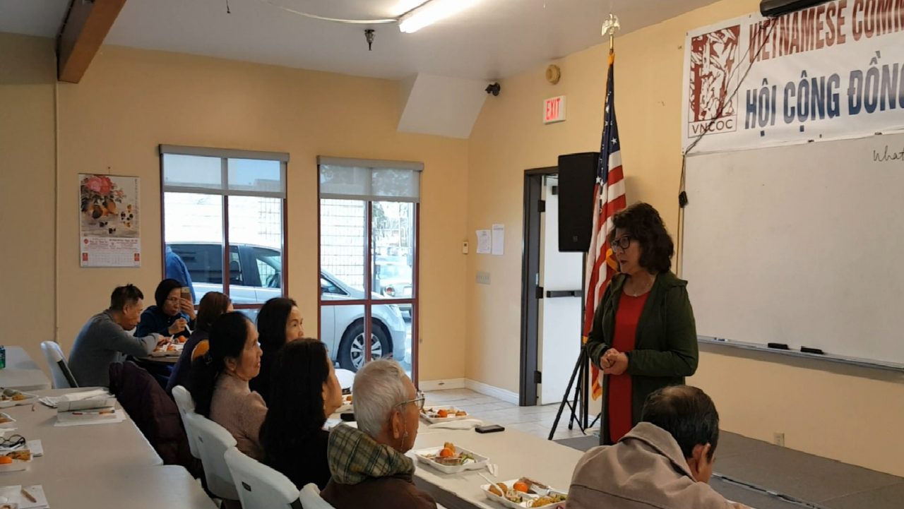 Bà Xuân Lâm, người vừa đậu quốc tịch, chia sẻ kinh nghiệm thi với học viên lớp quốc tịch do Hội Cộng Đồng Người Việt tổ chức