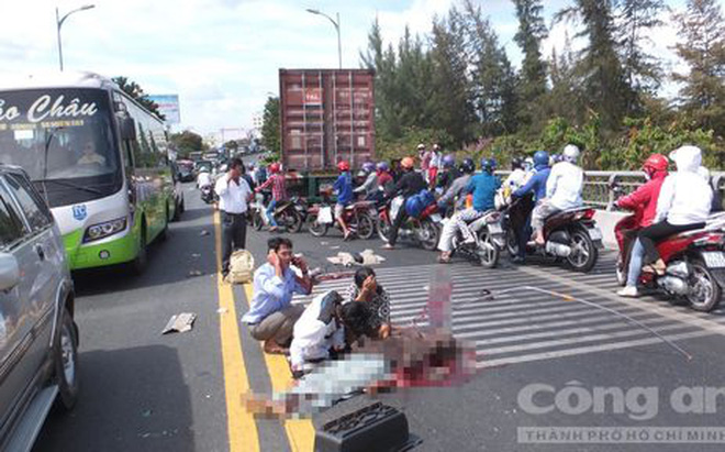 Cùng lúc, xe máy BS: 71C1 - 101.31 do một thanh niên điều khiển cùng chiều với xe container không thắng kịp va chạm vào rơmoóc bị thương.