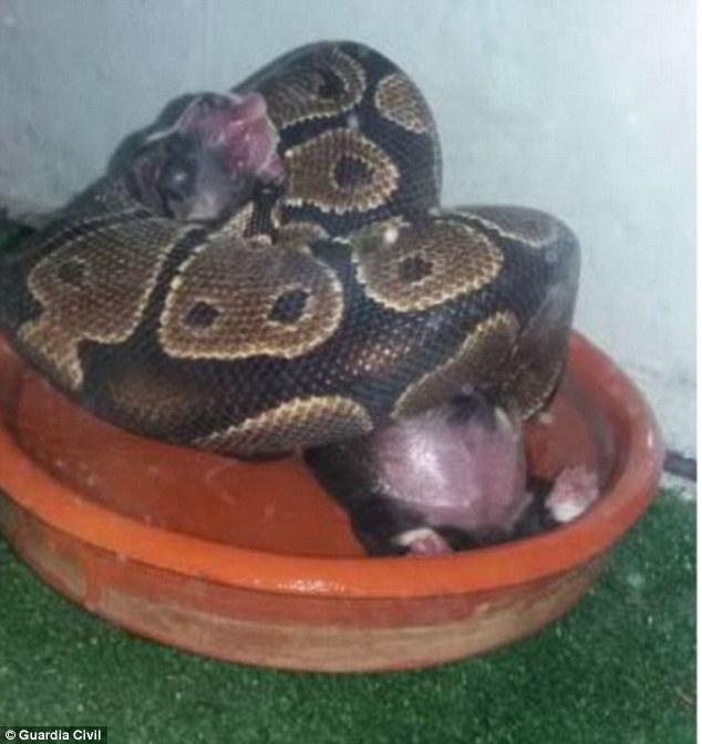 Seprona, đơn vị bảo vệ động vật của Tây Ban Nha nhận được tin báo sau khi cô gái đăng tải ảnh con trăn hoàng gia nghiền chết chó con lên mạng.
