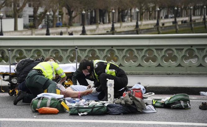 Các nhân viên y tế sơ cứu người bị thương trên cầu Westminster tại London ngày 22.3 Reuters