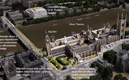 Khu vực xảy ra vụ tấn công khủng bố trung tâm London hôm 22/3. Đồ họa: Guardian.