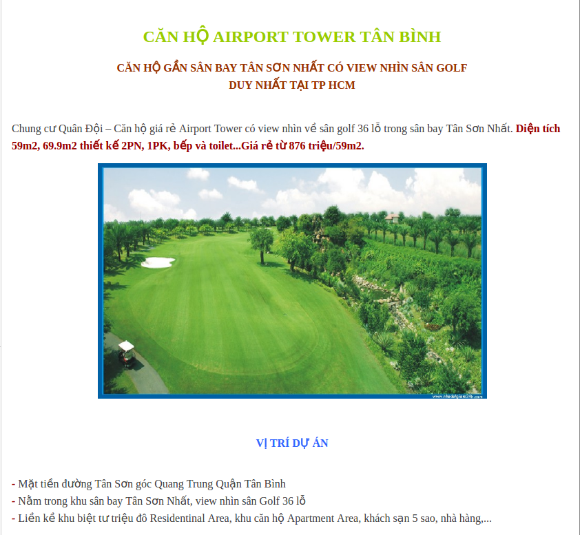 Với 54 biệt thự, 1 khách sạn 5 sao cho thuê, riêng cụm 8 tòa chung cư Airport Tower view cao 12 tầng với hàng ngàn căn hộ cao cấp, nằm trong sân golf Tân Sơn Nhất, thuộc phần đất quốc phòng (công thổ quốc gia), cách đường băng sân bay vài trăm mét đã được mời chào công khai qua hợp đồng “mua đứt bán đoạn” trên mạng truyền thông như sau: